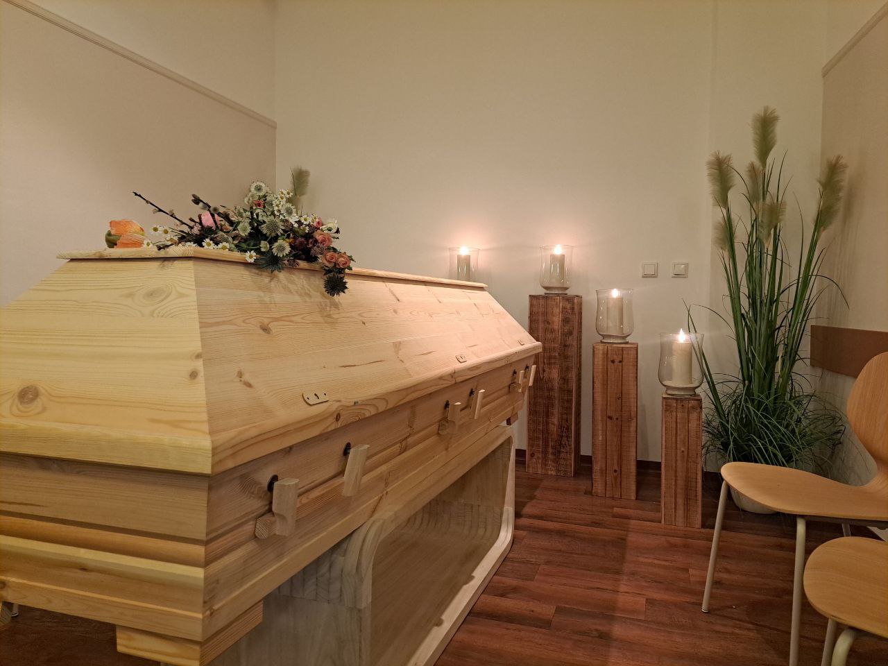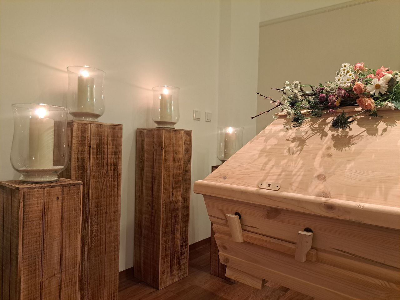 Wir können unsere Verstorbenen bis zu 36 Stunden nach Eintritt des Todes zuhause, im Hospiz oder in einem Raum zum Abschiednehmen aufbahren. Auch wenn ein Mensch im Krankenhaus verstorben ist, kann er noch einmal nach Hause überführt werden, um einen liebevollen Abschied zu gestalten.